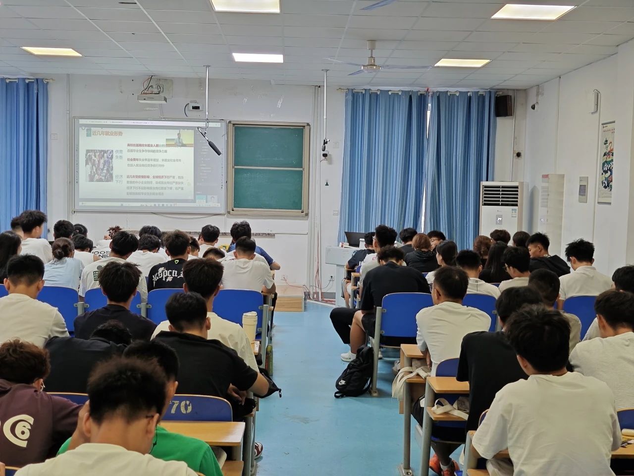 此次生涯规划第一课,由学校工作部副部长、创新创业学院院长陈新令,就业中心主任马洪,就业指导导师陶珊珊亲自授课,深入浅出地讲解了生涯规划的重要性,引导学生从入学之初就开始思考个人兴趣、职业倾向以及未来发展方向。积极鼓励同学们通过明确个人目标,合理规划时间资源,提升竞争力。观影现场的同学们纷纷充满期待说出自己的梦想和对未来大学生活的规划。